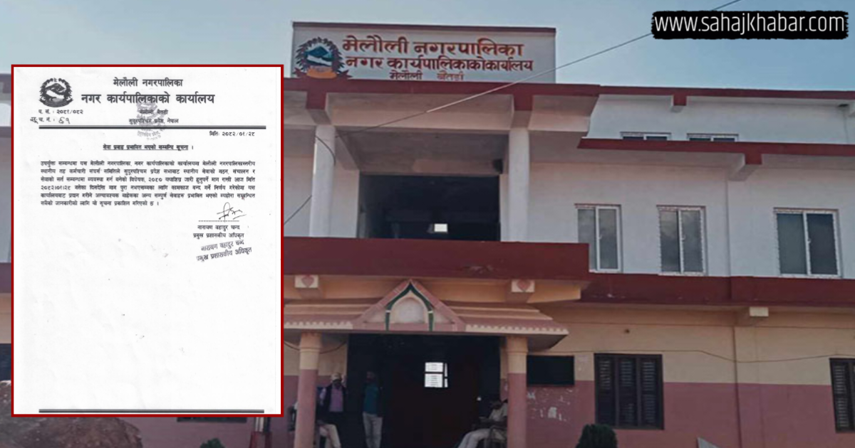 मेलौली नगरपालिका स्तरिय स्थानिय तह कर्मचारी संघर्ष समितीले सुदुरपश्चिम प्रदेश सभाबाट स्थानिय सेवाको गठन, संचालन र सेवाको सर्त सम्बन्धमा व्यस्था गर्न बनेको विधेक, २०८० यथाशीघ्र जारी हुनुपर्ने माग राख्दै आइतबारबाट माग पुरा नभएसम्मका लागि कामकाज बन्द गर्ने निर्णय भएको पत्र मार्फत जानकारी गराएको छ ।