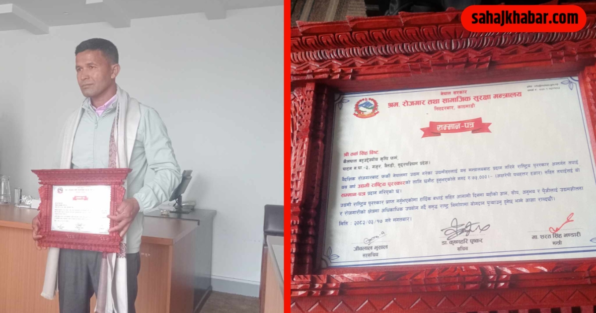 बैतडीको पाटन ३का बिष्ट उद्यमी राष्ट्रिय पुरस्कारबाट सम्मानित