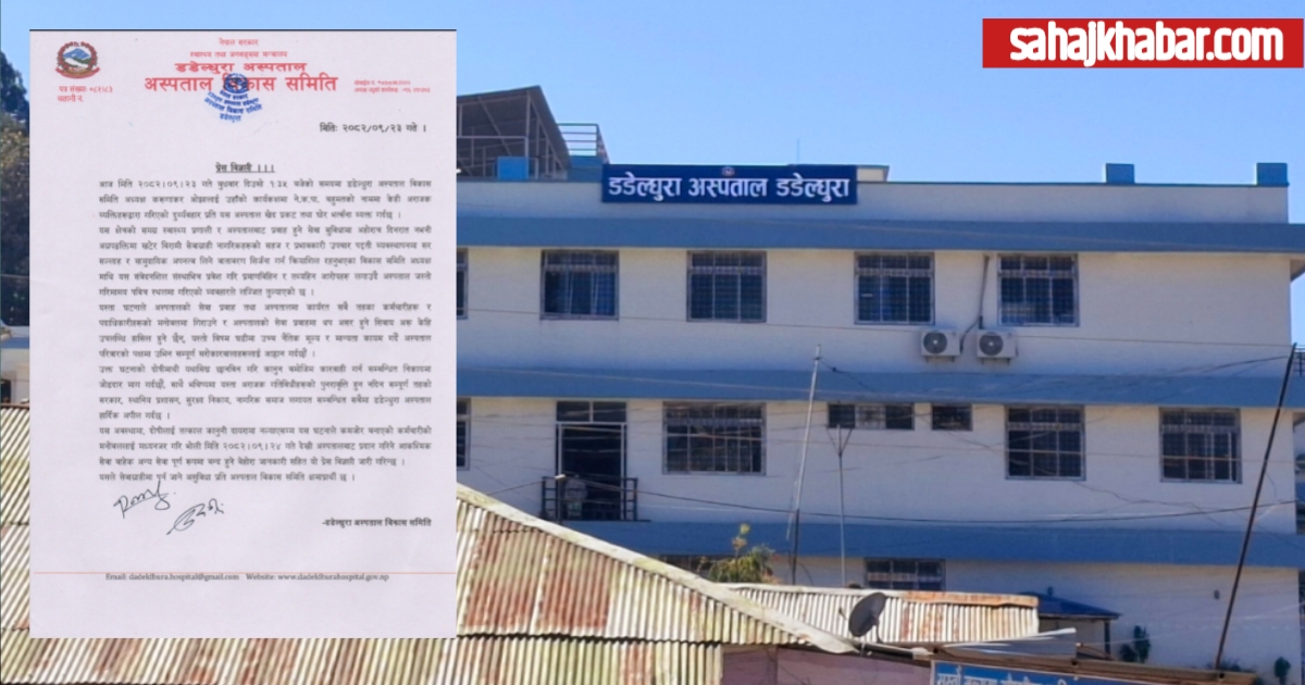 डडेल्धुरा : डडेल्धुरा अस्पताल विकास समिति अध्यक्ष करूणाकर ओझालाई कार्यकक्षमा दुव्र्यवहार भएको घटनाको विरोधमा बिहीबारदेखि आकस्मिकबाहेकका सम्पूर्ण सेवाहरू बन्द गरिने भएको छ ।